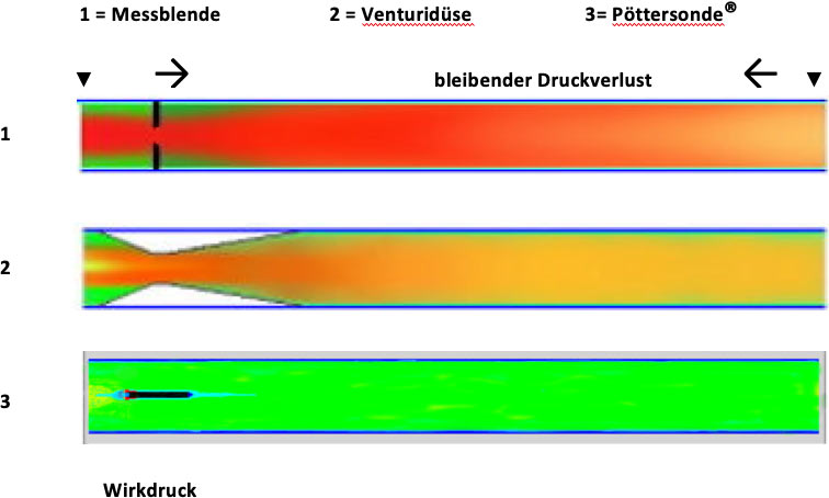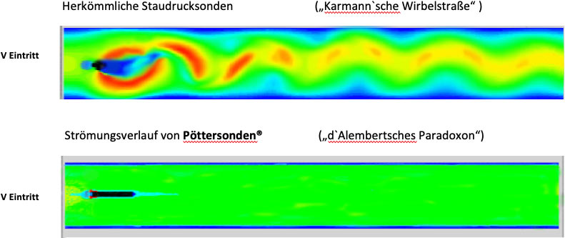 - Es gibt fast keinen bleibenden Druckverlust (Energieverlust). Bei den schwertförmigen Pöttersonden® mit einer Stirnbreite von nur 8 mm wurde die Anströmfläche gegenüber herkömmlichen Sonden um ca. 85 % reduziert. Durch das Eulersche/d'Alembertsche Paradoxon wird zudem der bleibende Druckverlust fast völlig eliminiert. Der Staudruck löst sich im Reibungswiderstand der Pöttersonde® auf; der Druck-/Energieverlust liegt unter der Nachweisgrenze.